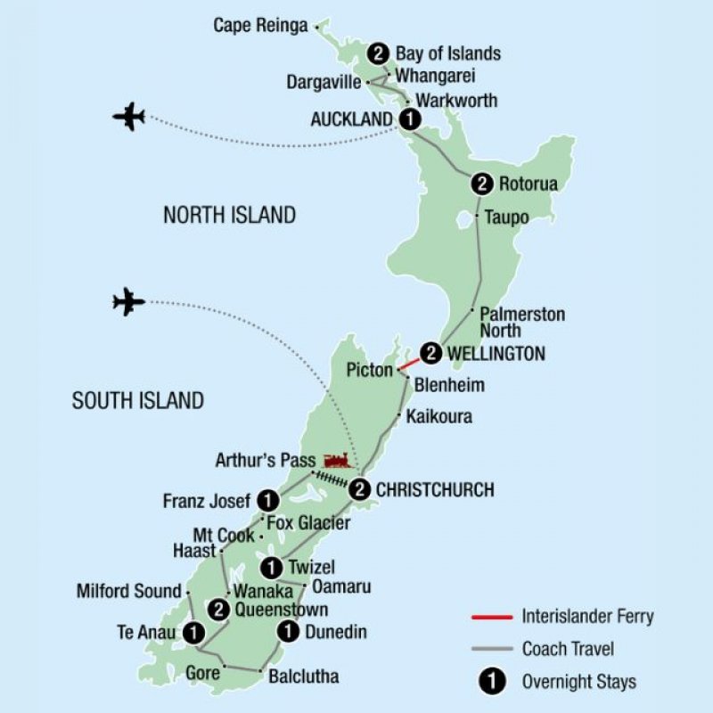 Auckland, Bay of Islands, Christchurch, Dunedin, Fox Glacier, Queenstown, Rotorua, Te Anau, Wellington
