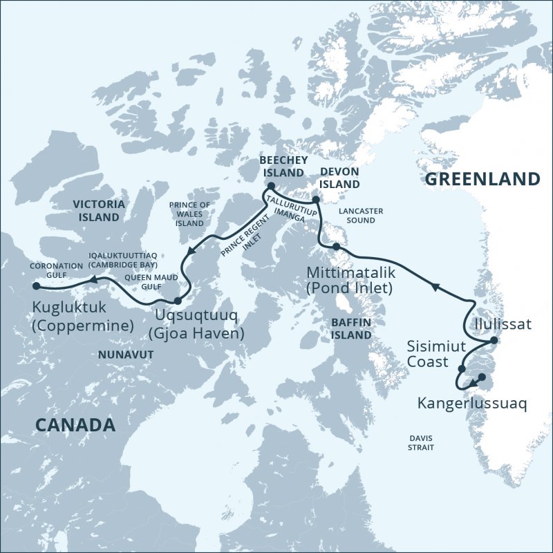 Search this area rich in marine and avian life for the thick-billed murres, ivory gulls, beluga, narwhal, and bowhead whales who reside in the ice-strewn waters. Delve deeper into the exploration of the Northwest Passage and the mercantile efforts of the Hudson's Bay Company at intriguing expedition landing sites.