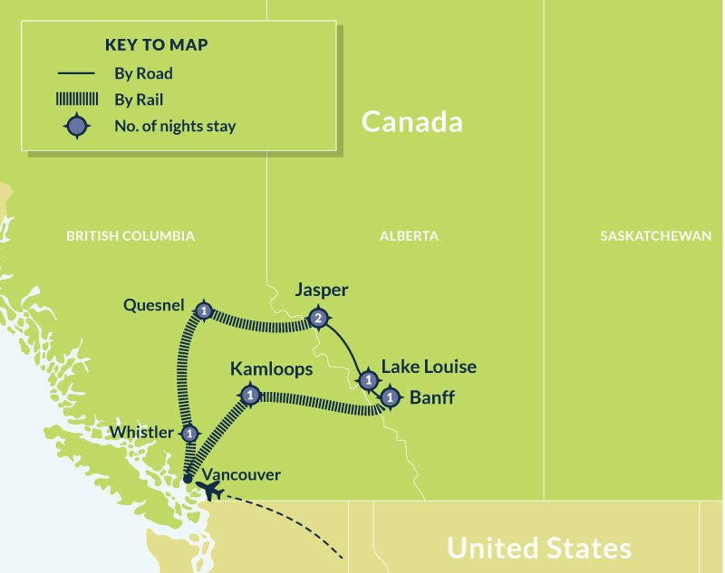 Following your shuttle transfer from downtown Vancouver, the Rocky Mountaineer will take you through the stunning scenery of the Sea to Sky Corridor to the resort town of Whistler. Highlights of the trip include spectacular views of Howe Sound and the Coast Mountains, Brandywine Falls, Mount Garibaldi, and the impressive Cheakamus Canyon. The remainder of the day is at your leisure to explore Whistler village.