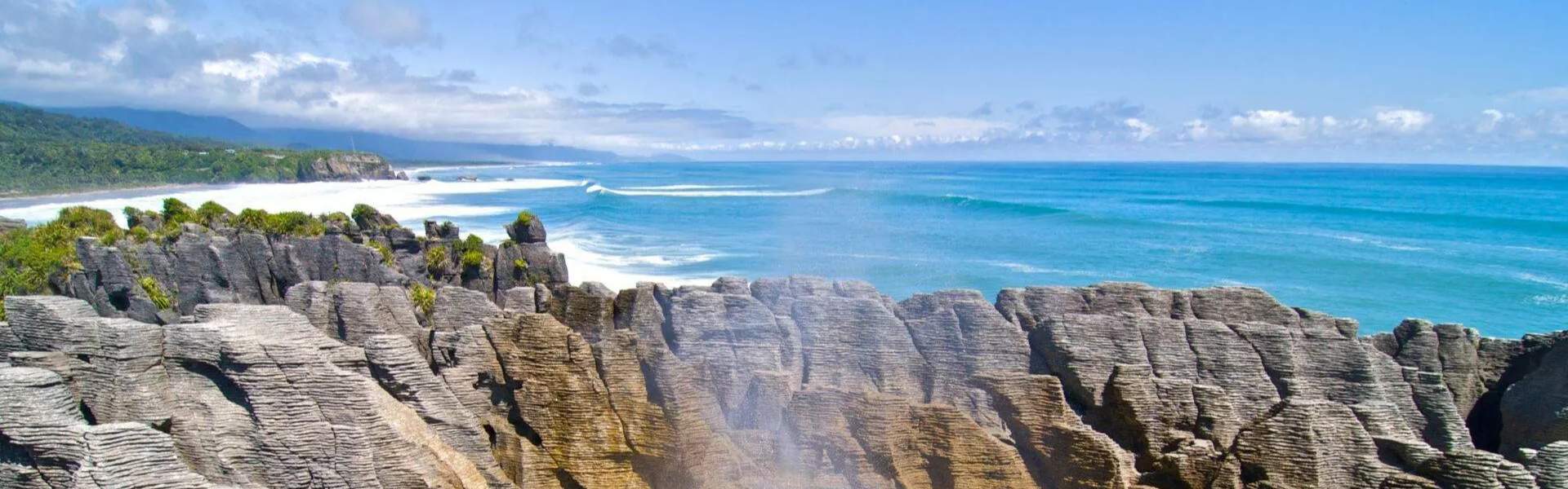 Driving via the Nelson Lakes National Park – an enchanting alpine landscape of rugged peaks, forests, stunning glacial lakes and the beginning of the awe-inspiring Southern Alps make a stop at the quaint village of St. Arnaud on the shores of Lake Rotoiti. Turn inland to follow the Buller River Gorge – one of the world’s best but least-known scenic drives, carved out of the forest by 19th century prospectors, it follows the deep river gorge, often crossing it on single-track bridges. Emerging from the forest the road hugs the coastline south to the small settlement of Punakaiki – renowned for its wild, rugged coastline and the famous ‘Pancake Rocks’ – these stratified limestone stacks are an extraordinary monument of nature.
