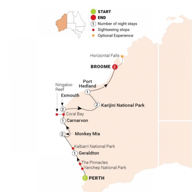 Almost two weeks of adventures lie before you, the first a tour of Perth. The Western Australian capital almost steals the street-art trophy from Melbourne, the city’s alleys and warehouses decorated with eye-popping murals and installations from local creatives. It’s also remarkably green, with 400-hectare Kings Park and Botanic Garden sitting pretty in the CBD, on a lazy bend of the serpentine Swan River. Two thirds of the grounds are reserved for native plants, but there are also seasonal wildflowers, all enveloping the Anzac Memorial. If you don’t know your fellow travellers by now, you will by the time your welcome dinner is over.