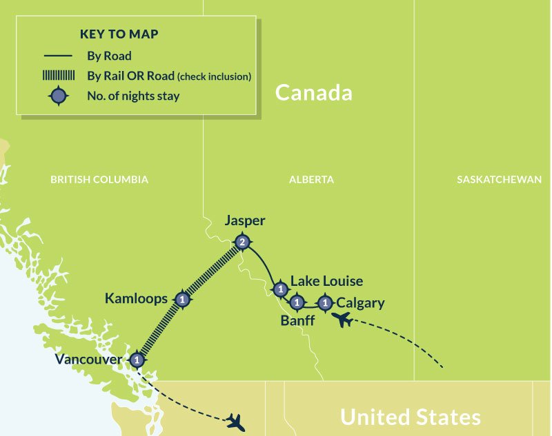 Banff, Calgary, Jasper, Kamloops, Lake Louise, Vancouver