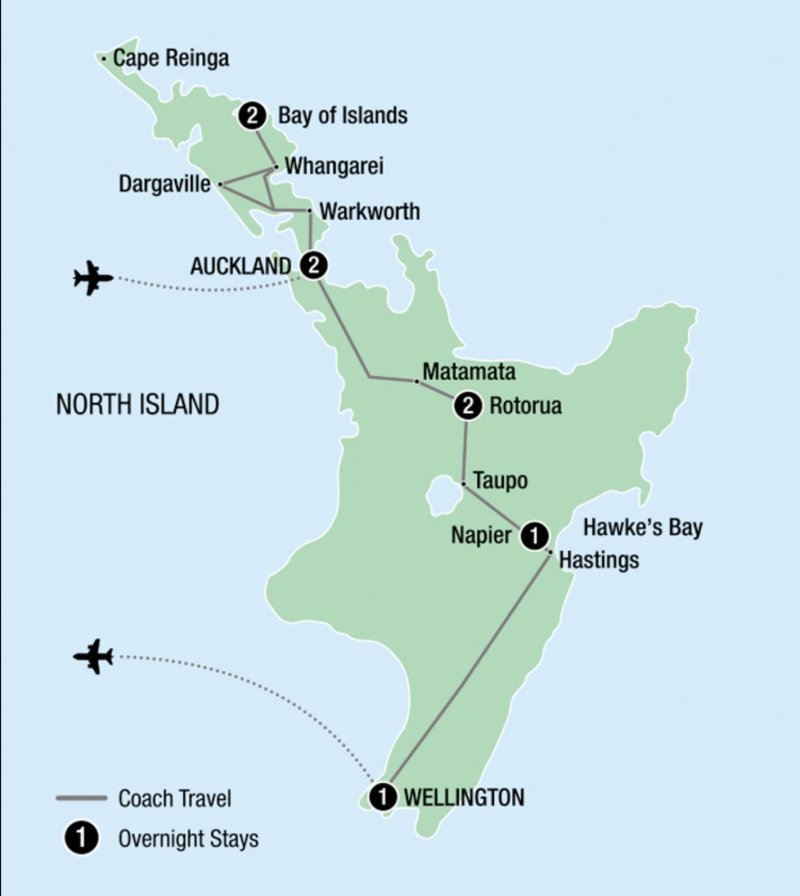 Auckland, Bay of Islands, Napier, Rotorua, Wellington