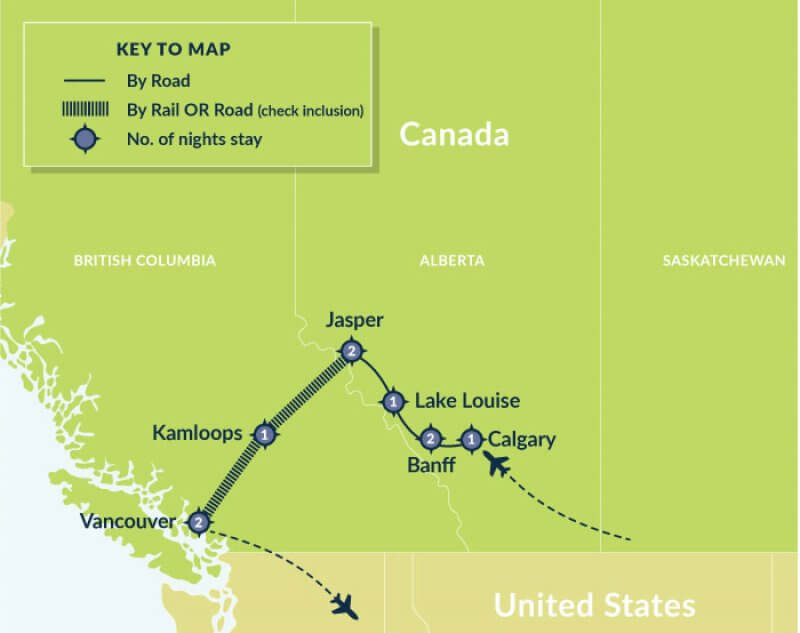 Note: Pricing is based on GoldLeaf Service onboard Rocky Mountaineer. Flights can arrive and depart at any time on the first and last day of the trip. Our TwinShare program is not available for this tour.